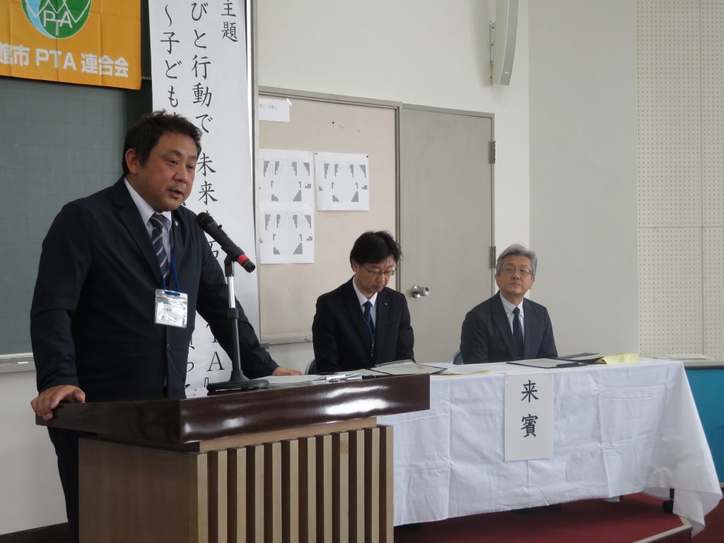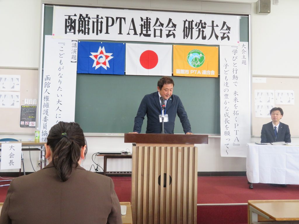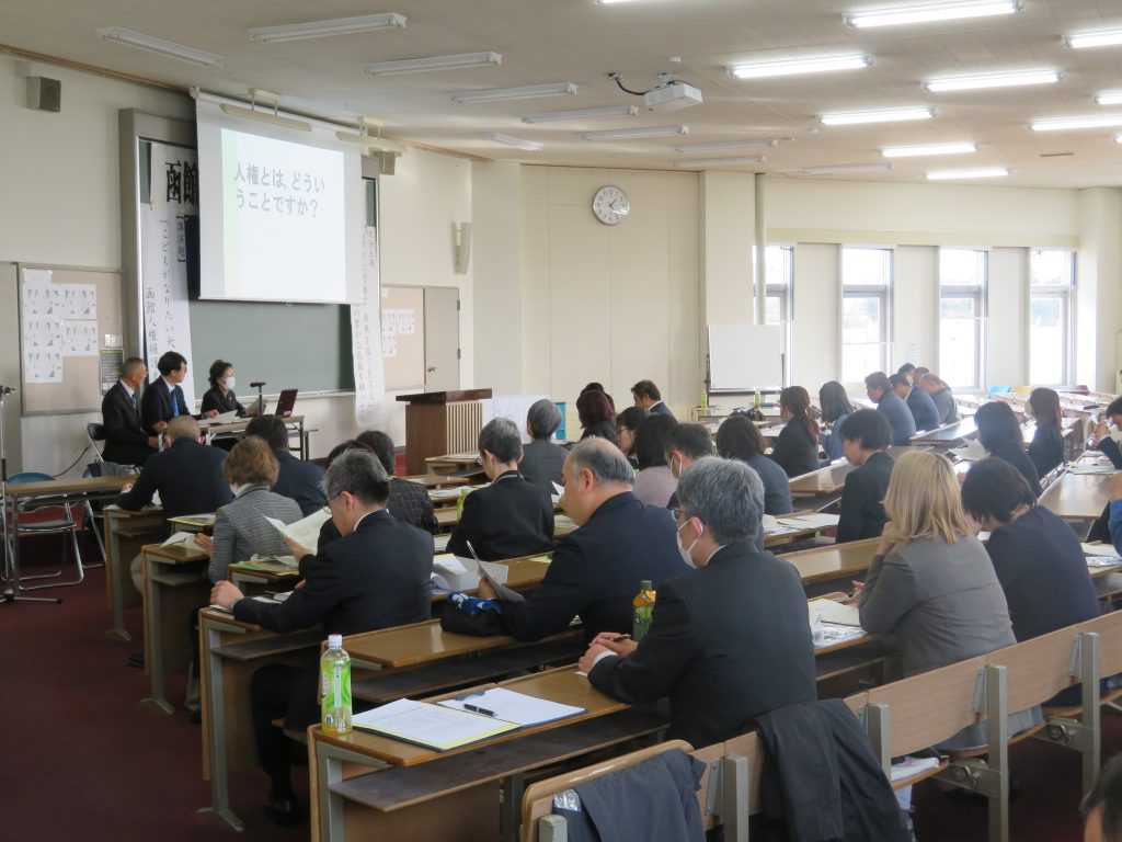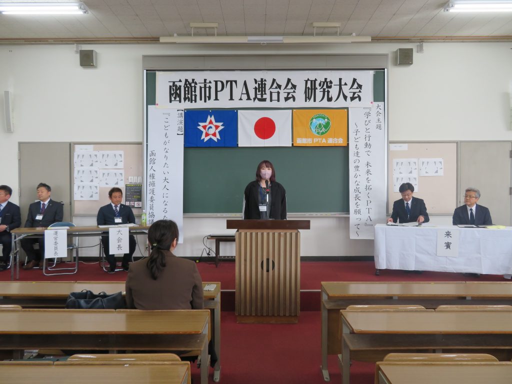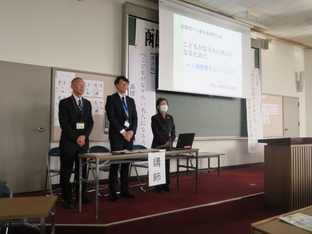 函館人権擁護委員会協議会の 会長 川合 裕紀子 氏 、 函館人権擁護連合会 の林 敏雄 氏、 函館地方法務局 の藤田 弘太郎 氏の3名に講演いただきました。